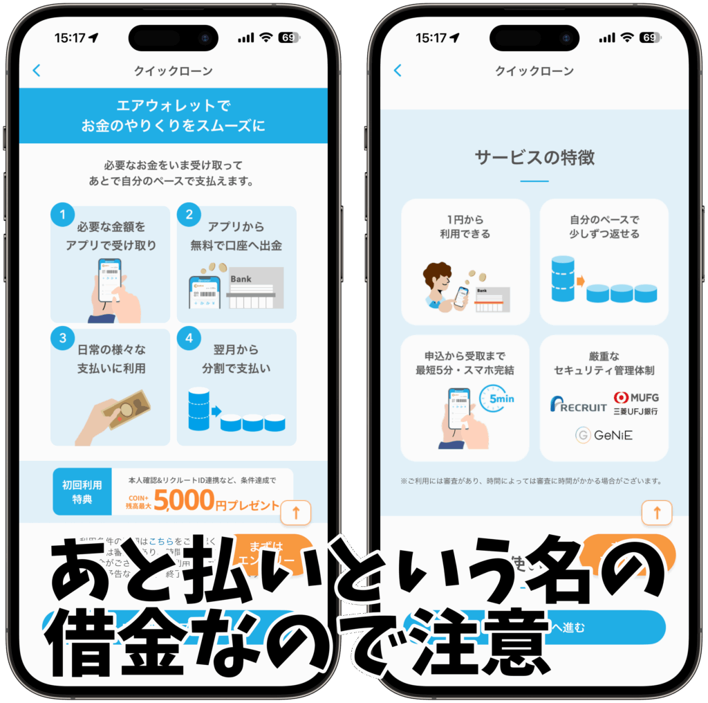 「後払いチャージって何?」と気になっている方も多いと思いますが、これはクイックローン、簡単に言えば「手軽にできる借り入れ」のような仕組み。必要な金額をアプリですぐに受け取り、支払いは翌月以降に分割で行うスタイルです。つまり実質的には借金ですので、メリットと注意点を理解して使いましょう。