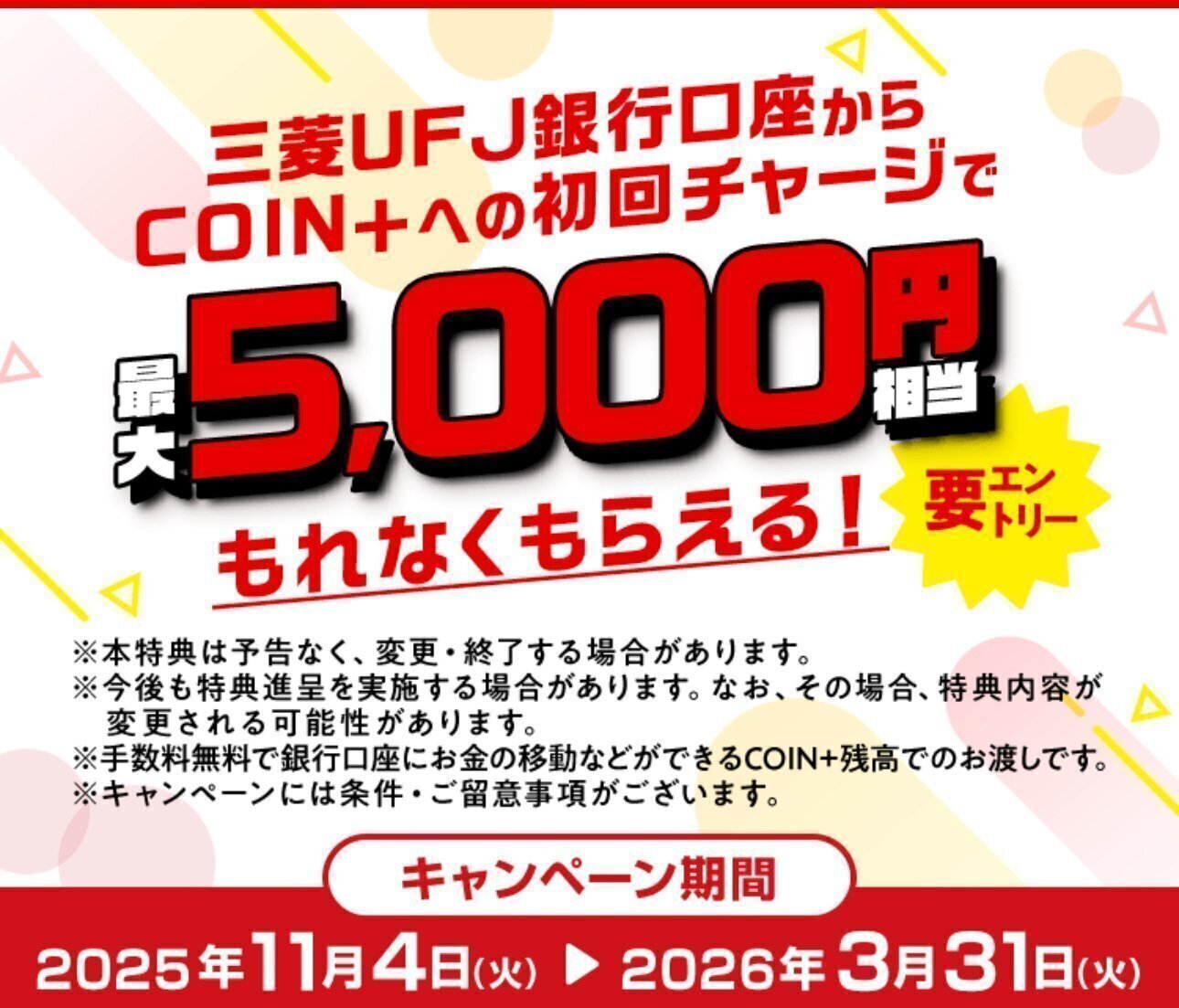 キャンペーンページからエントリーした後に、三菱UFJ銀行からエアウォレット(COIN+)にチャージすると、最大5000円相当の残高がもらえます!