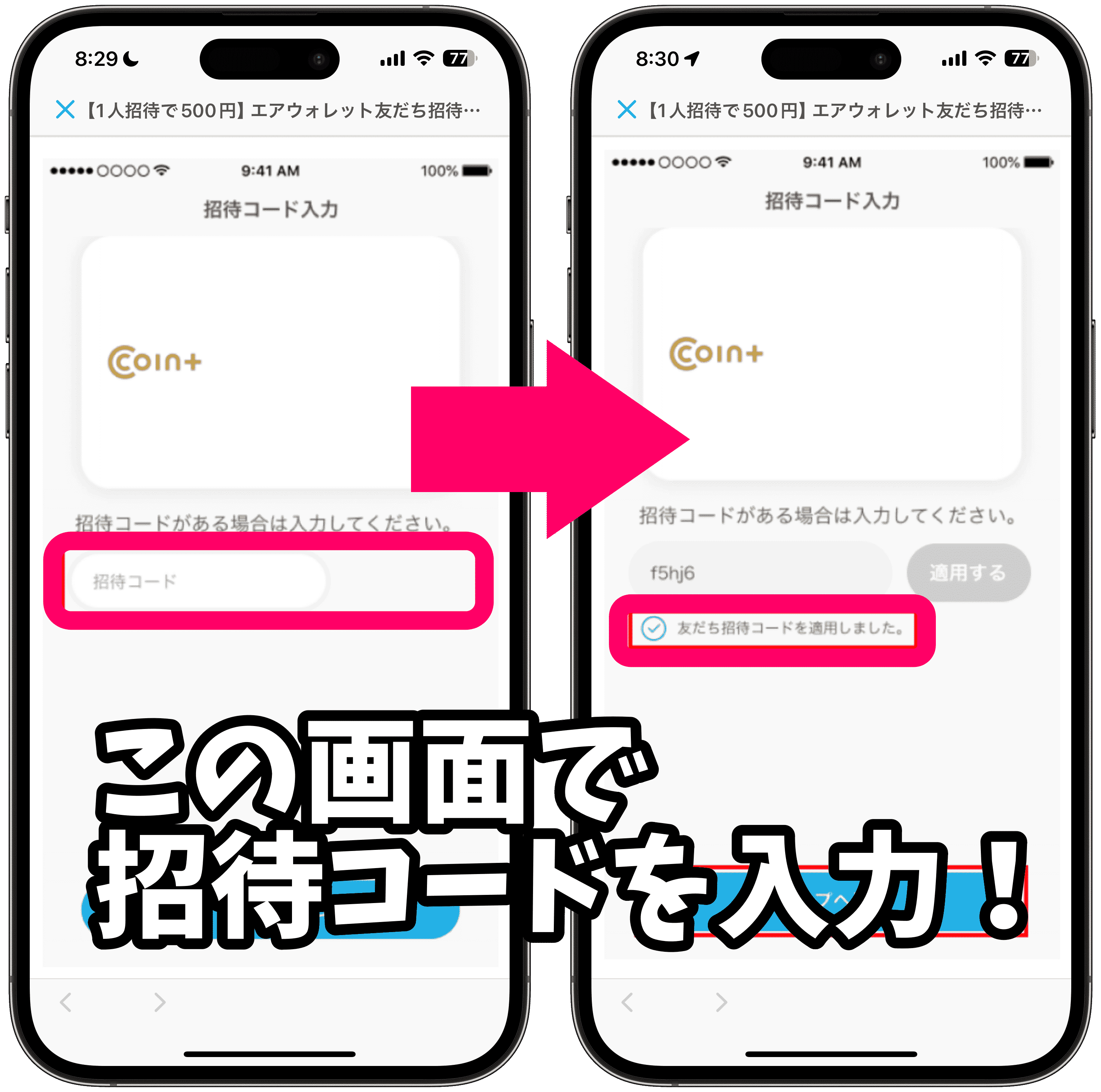招待コードを入力して新規登録するだけで、500円相当のCOIN+残高がもらえます。
