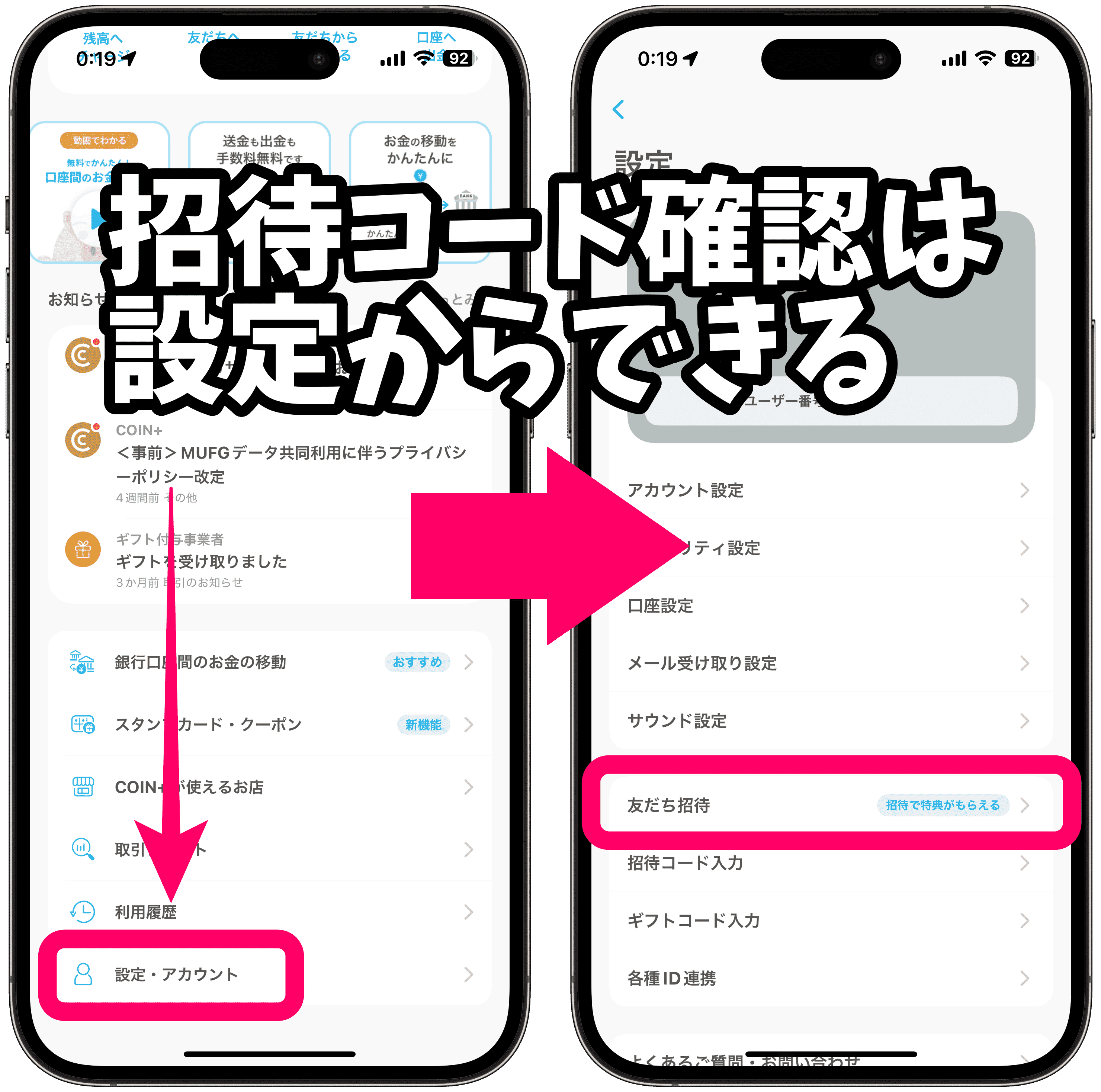 アプリトップ下部の「設定・アカウント」→「友だち招待」ページで、自分の招待コードが確認できます。そのコードをSNSやLINEでシェアすれば、誰でも紹介可能です。