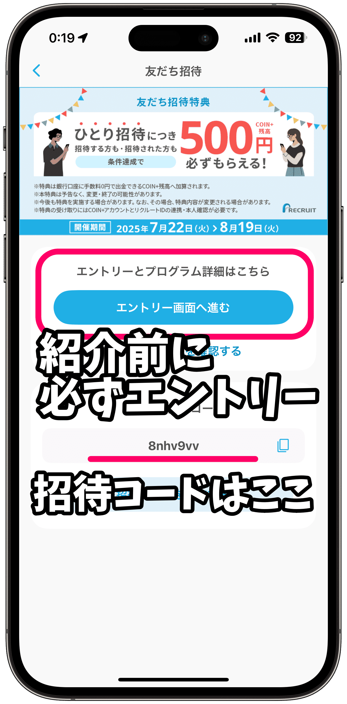 紹介キャンペーンは複数回開催されていますが、キャンペーンのたびに毎回招待コードが変更となり、毎回エントリーが必要なので注意です。