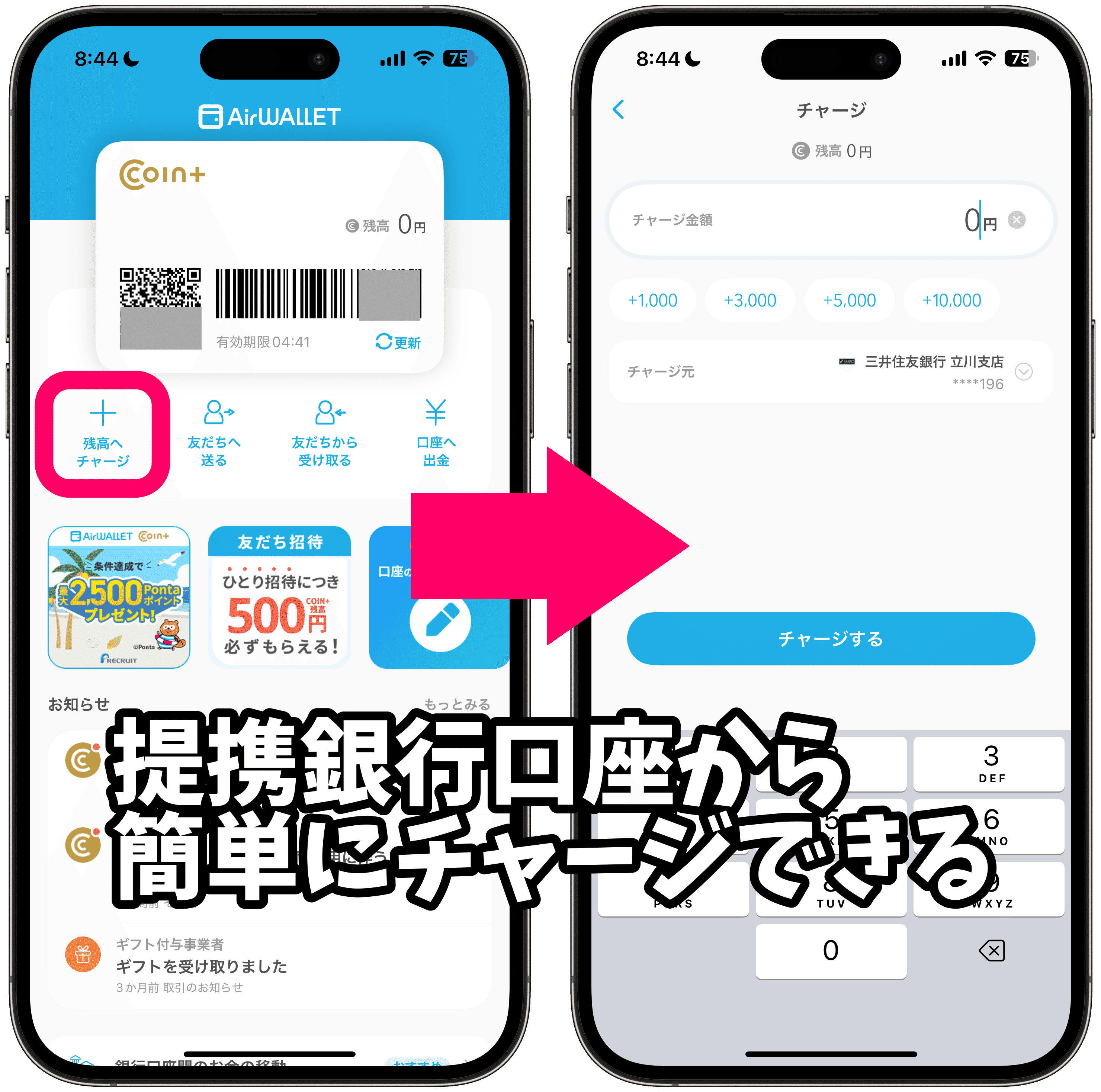 エアウォレットの口座作成が終わったら、早速チャージして使ってみましょう!